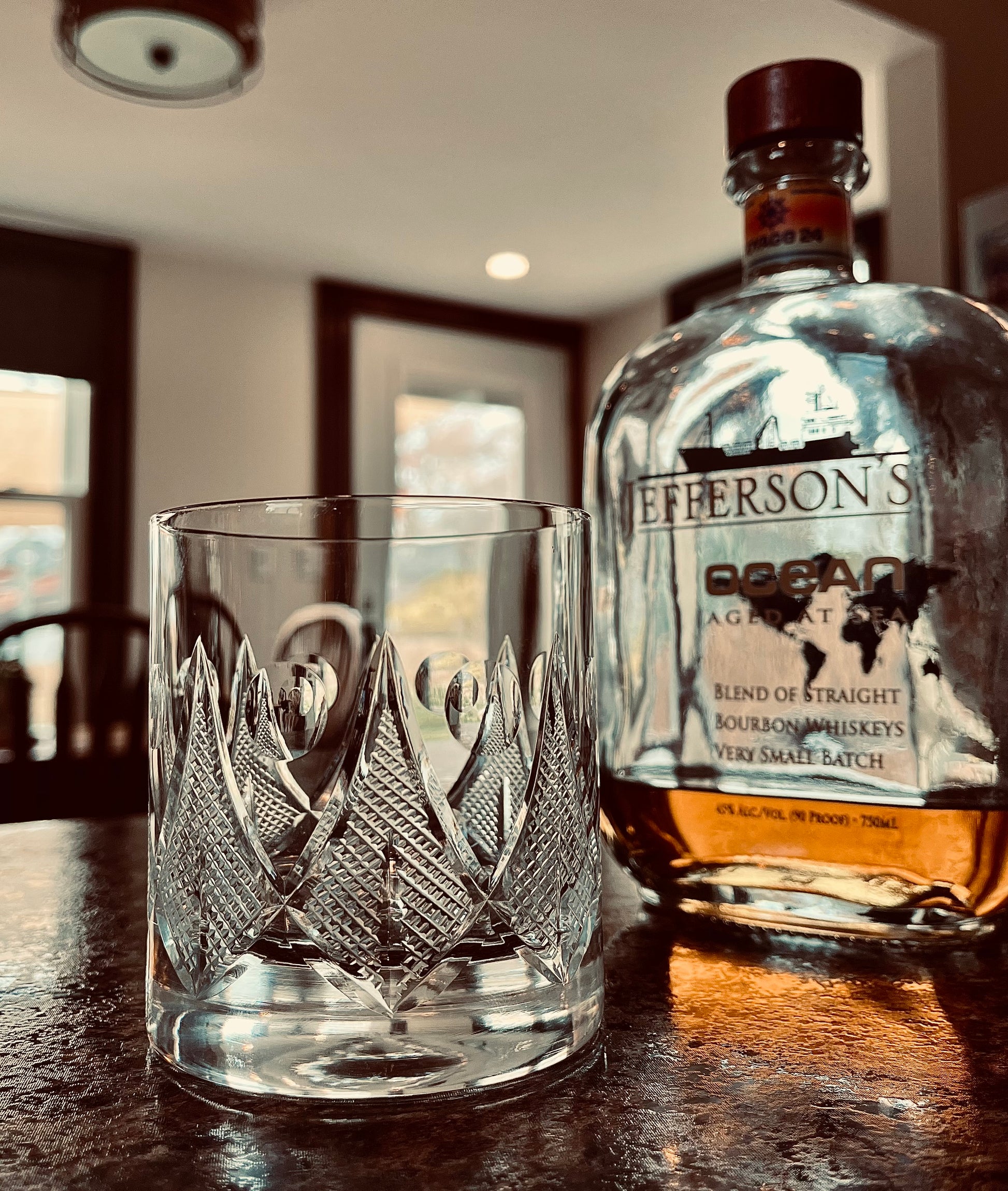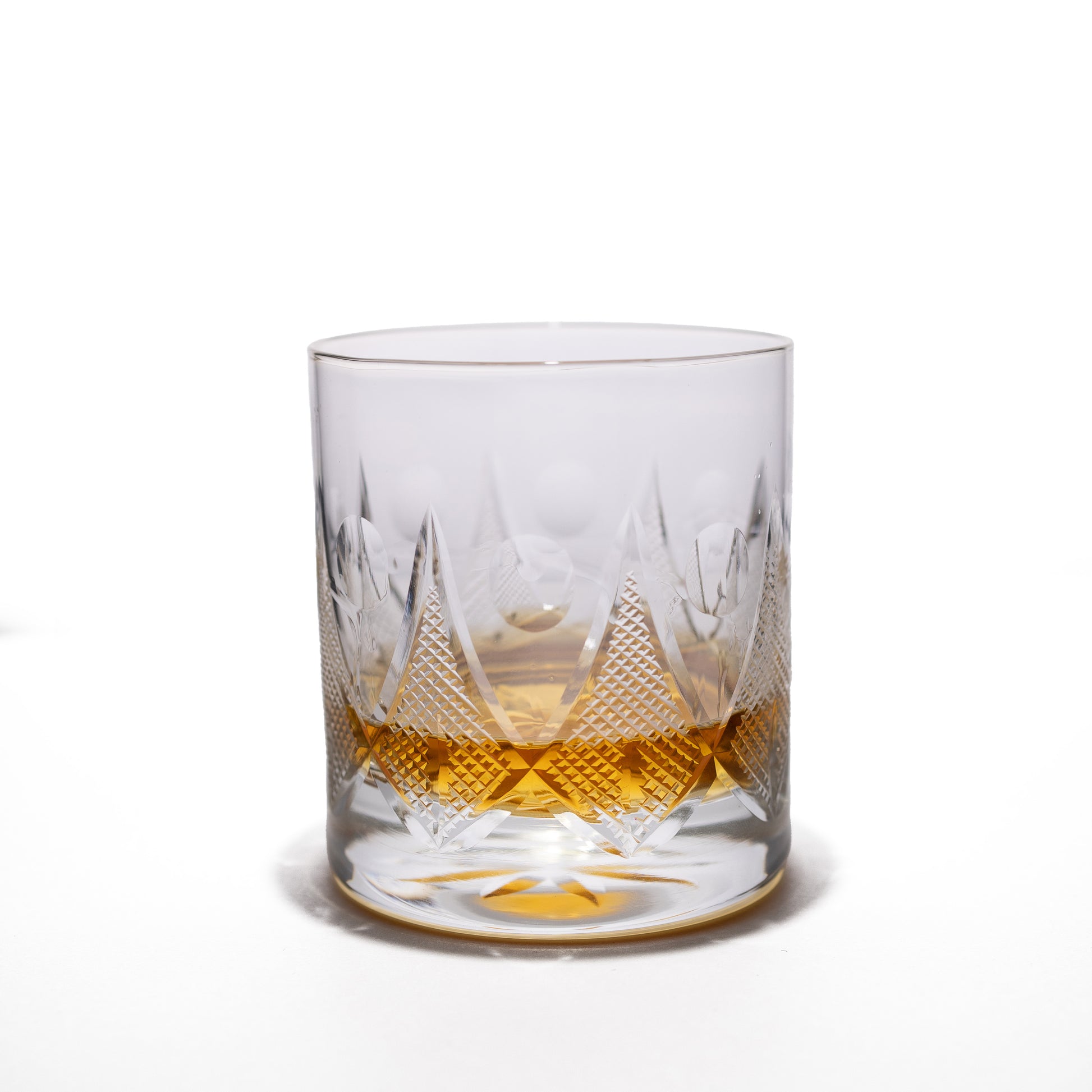 “Emperor”. Swooping upright cuts filled in with fine cut diamonds and optic spheres. The tall swooping design of this traditional design gives a stately feel with these beautifly cut rocks glasses. Each glass is cut with stone wheels and polished by hand, just like they did over a century ago.