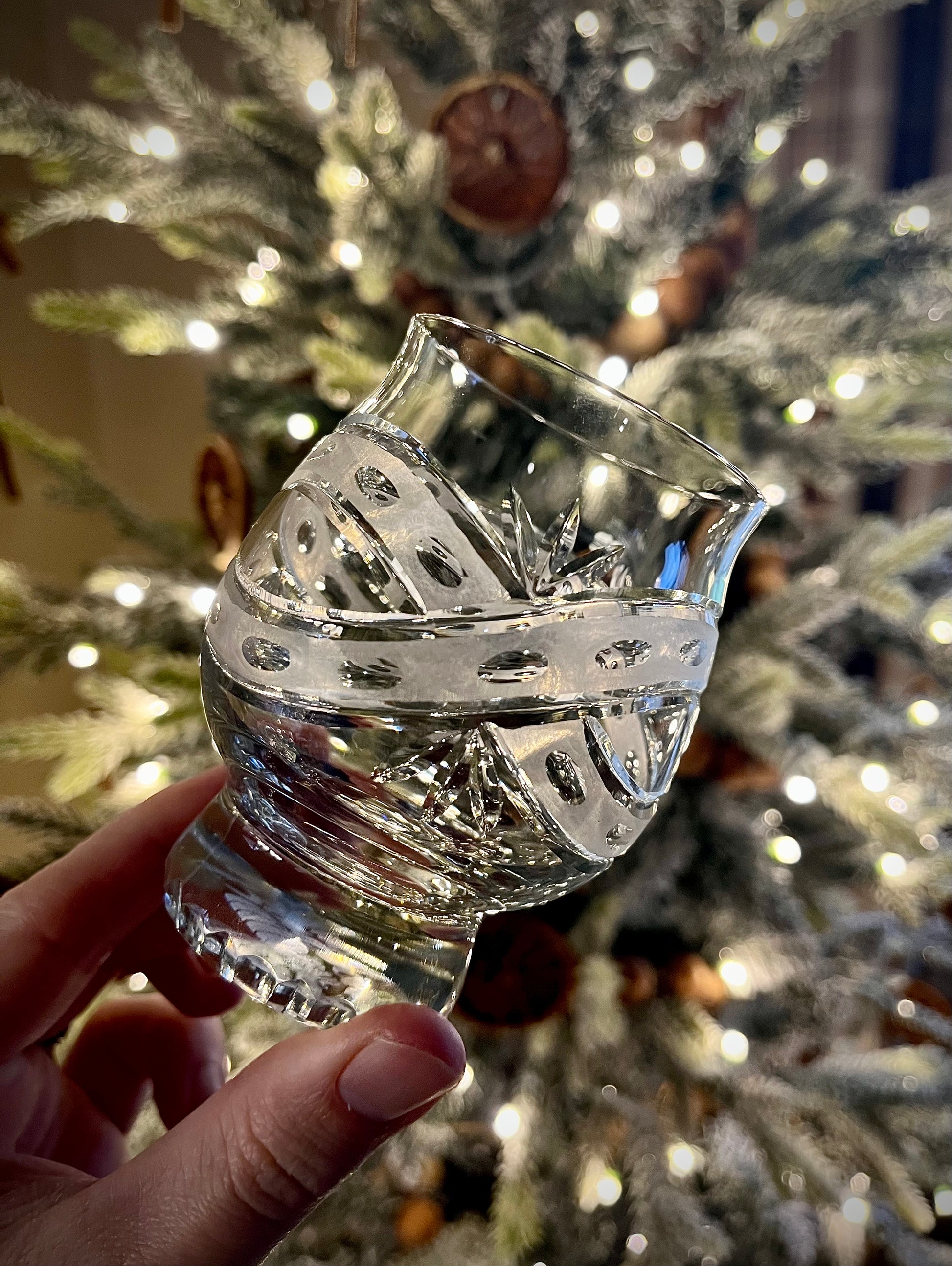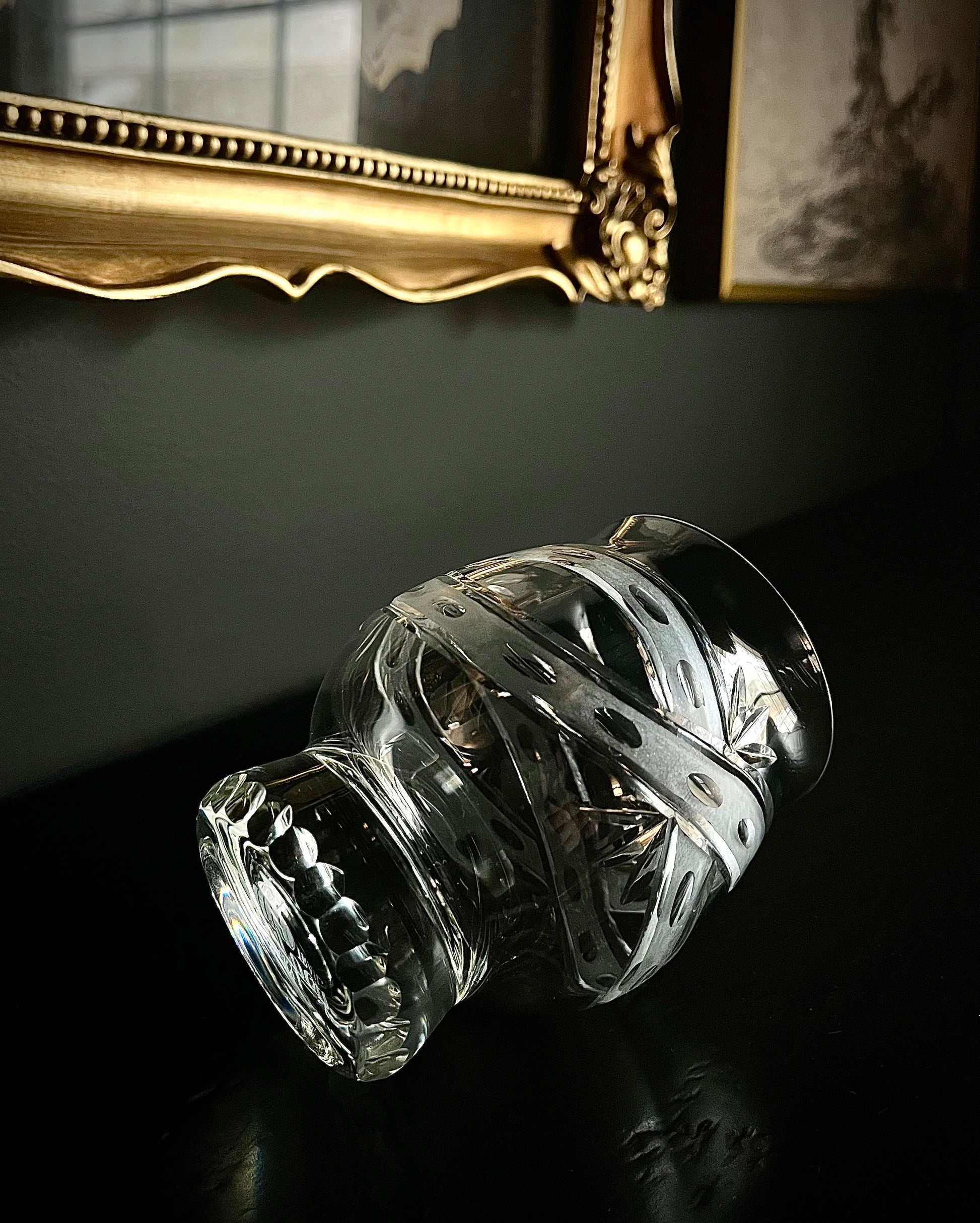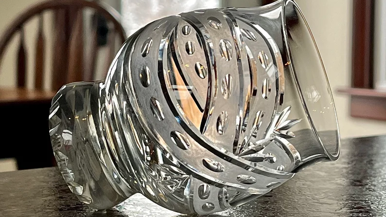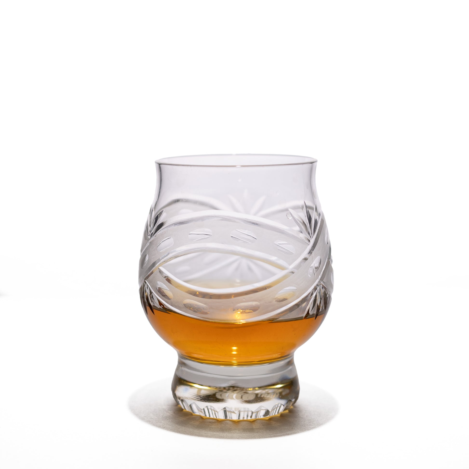 The "Hooley" design is a stunning and unique pattern inspired by Celtic style. The intricate design weaves over and under itself with polished and unpolished techniques that create a beautiful contrast. Hand cut and polished using traditional crystal cutting techniques in Ohio, this piece is a true work of art that will hold your gaze and captivate your attention.