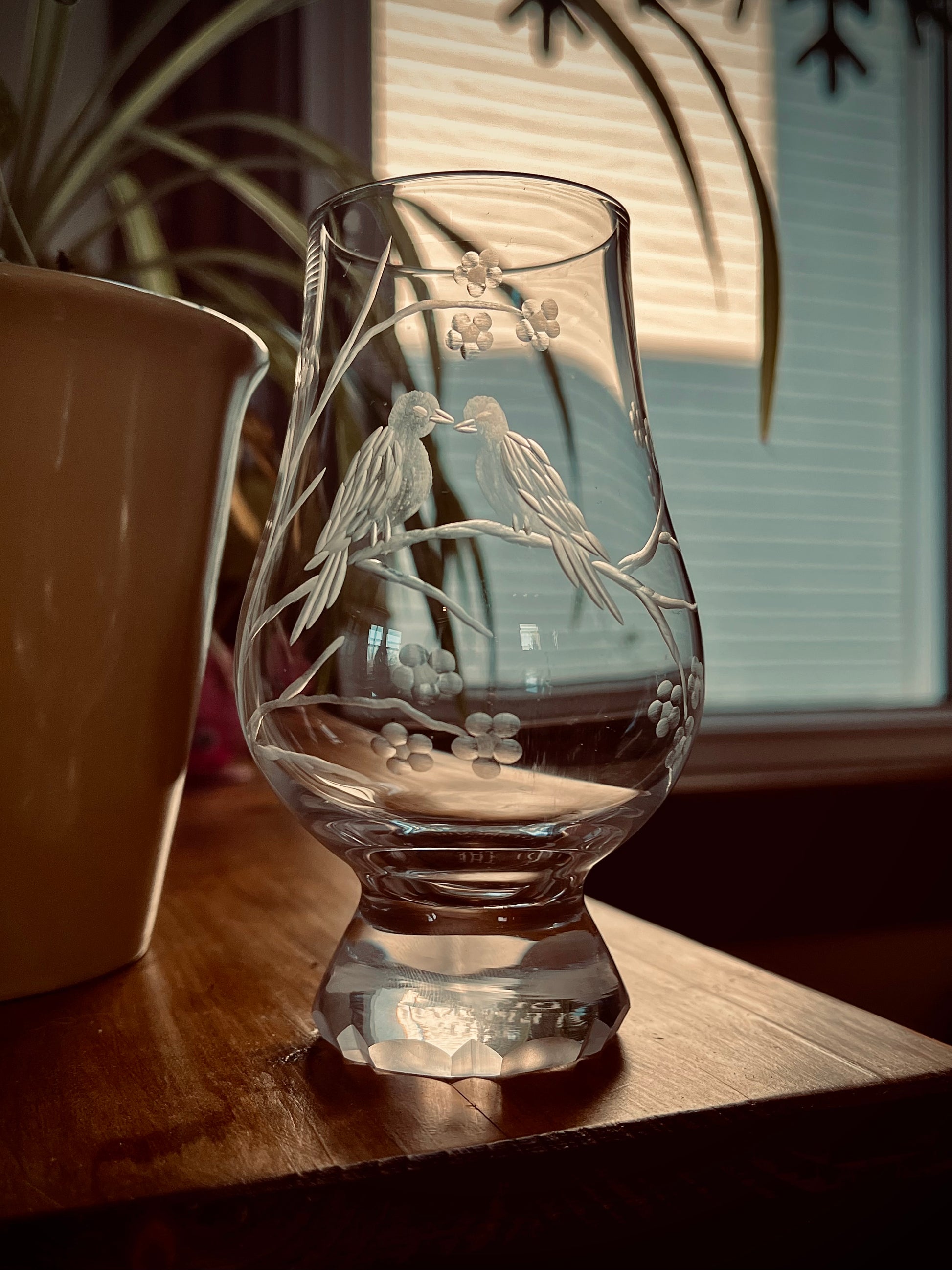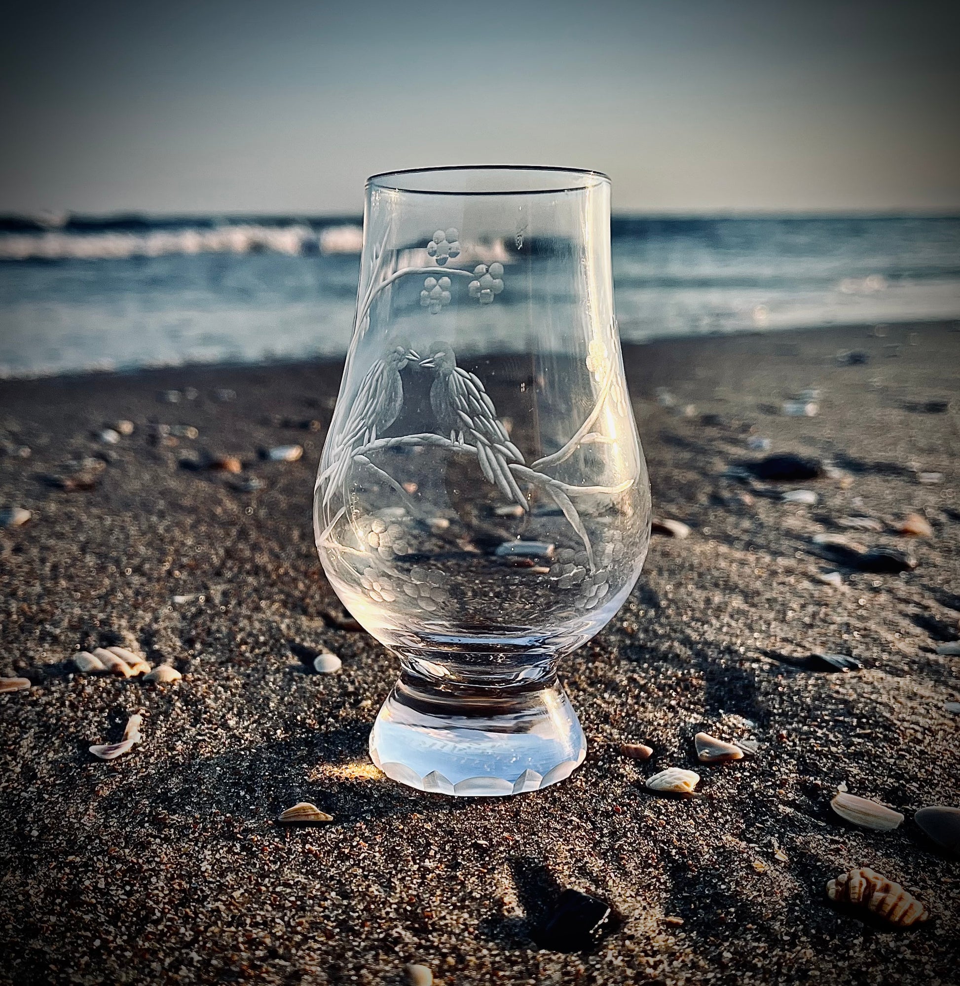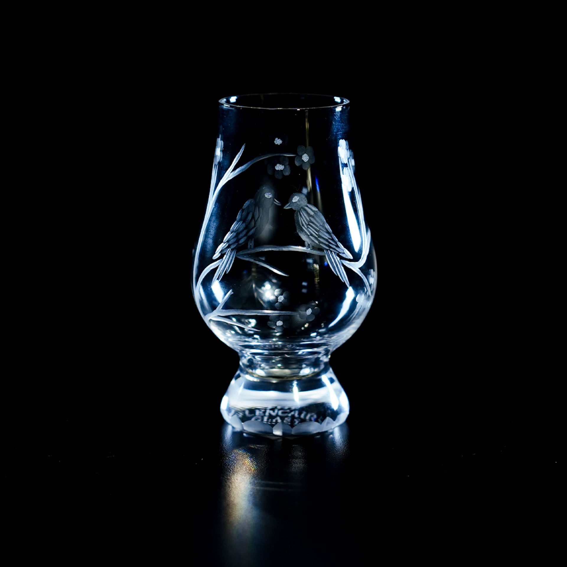 Give the Bourbon lover in your life an unforgettable gift with this rare hand cut, love bird Glencairn glass! Two love birds sit on a branch surrounded by budding flowers with a decorated foot.