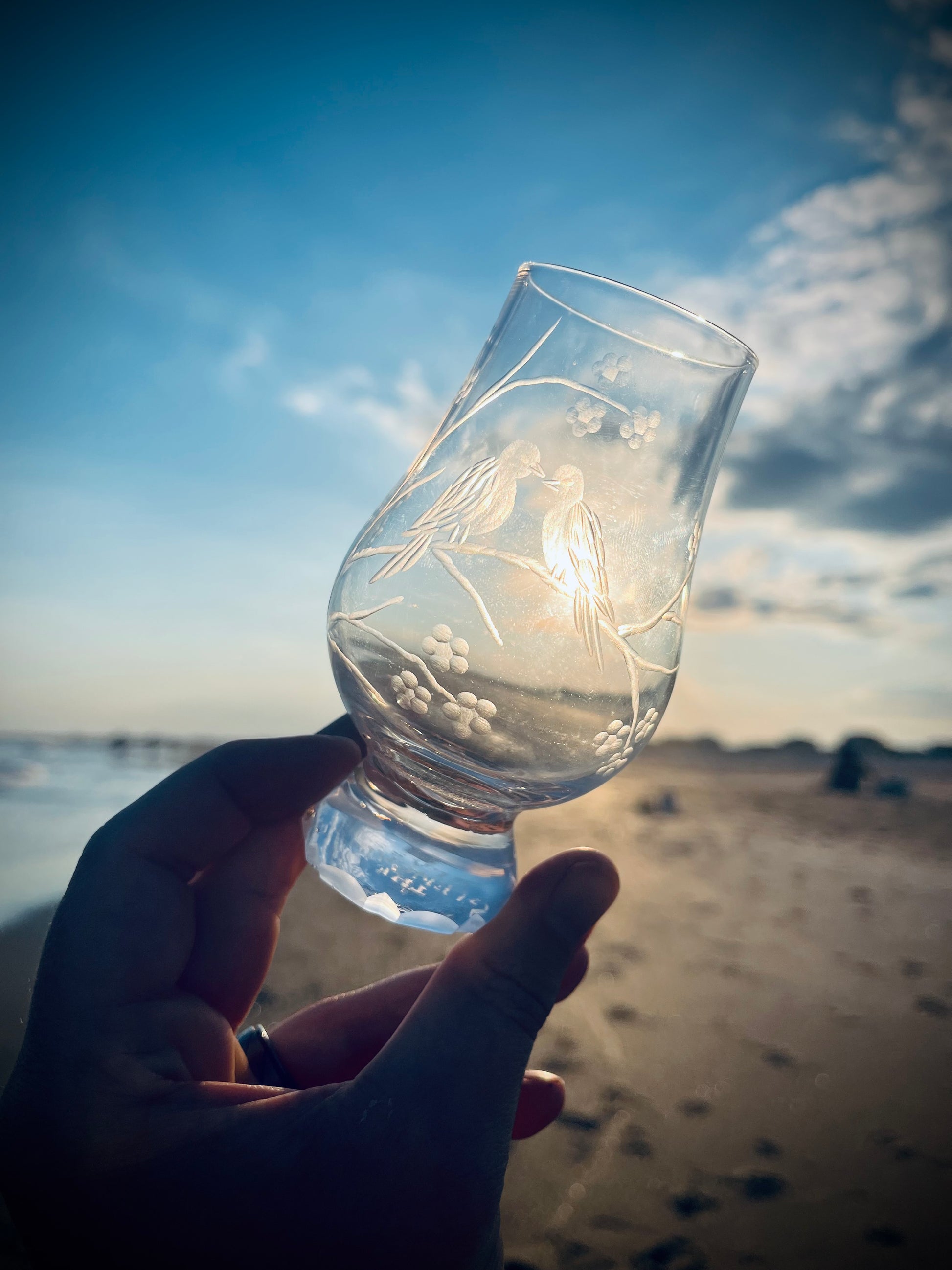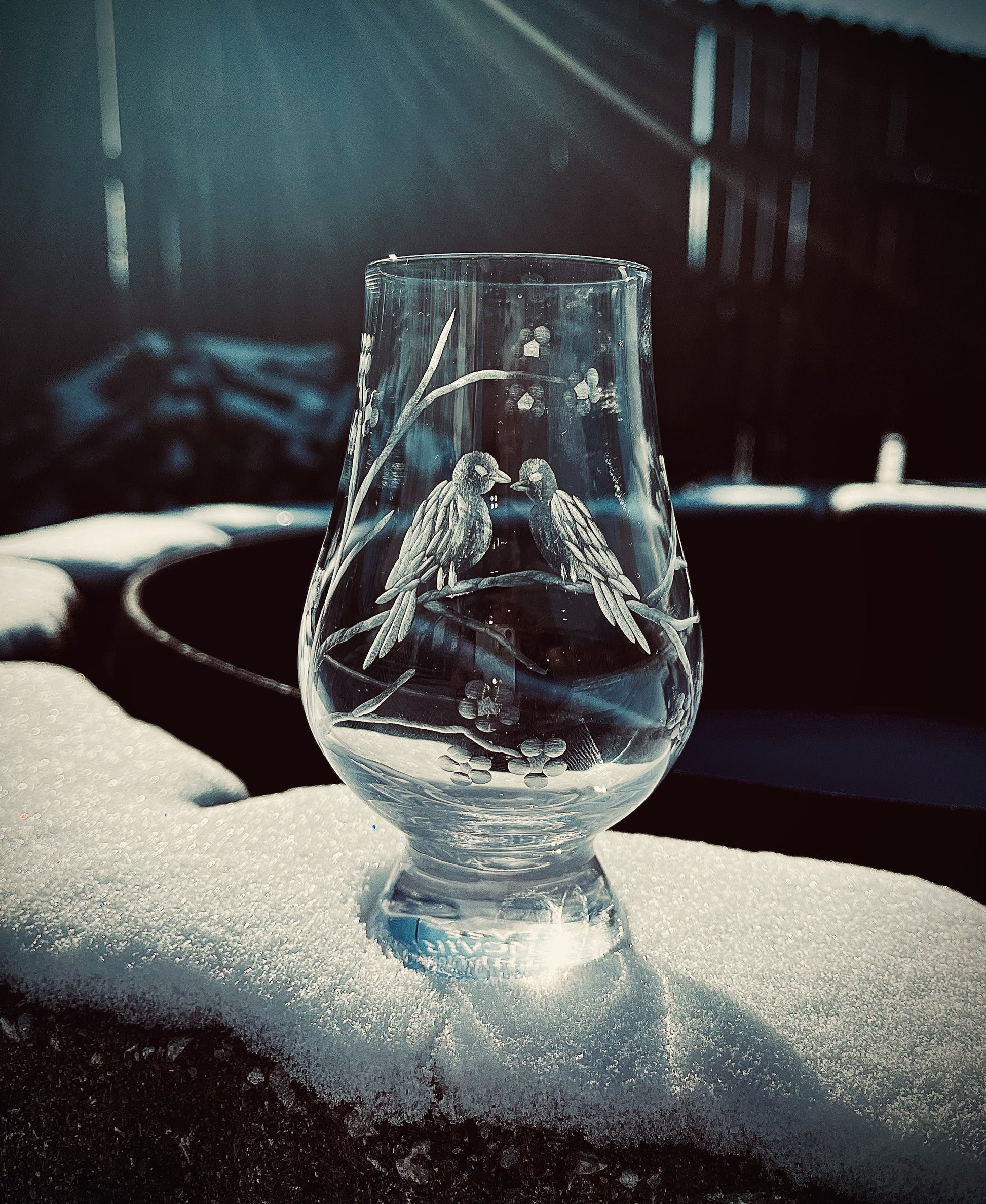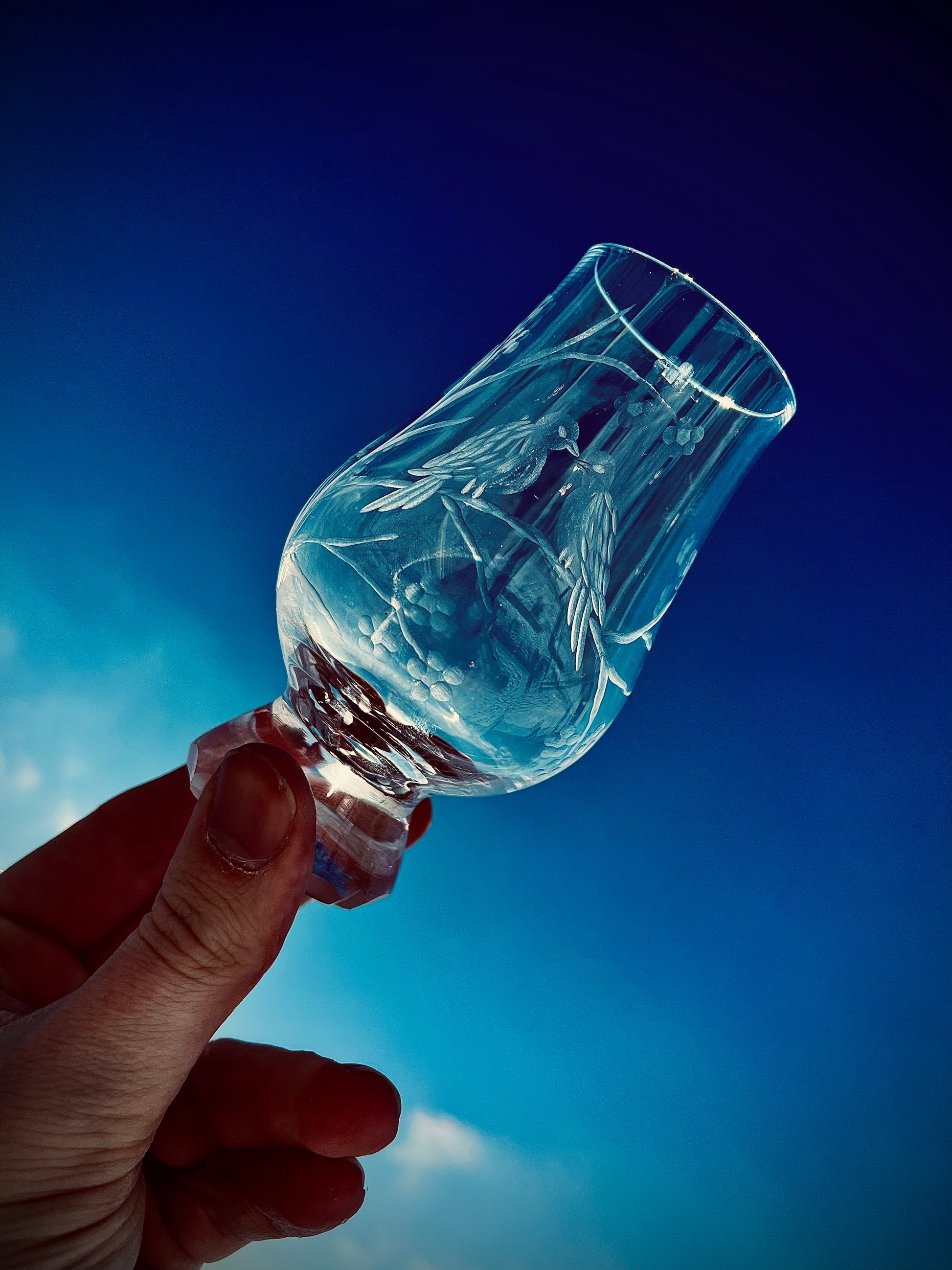 Give the Bourbon lover in your life an unforgettable gift with this rare hand cut, love bird Glencairn glass! Two love birds sit on a branch surrounded by budding flowers with a decorated foot.