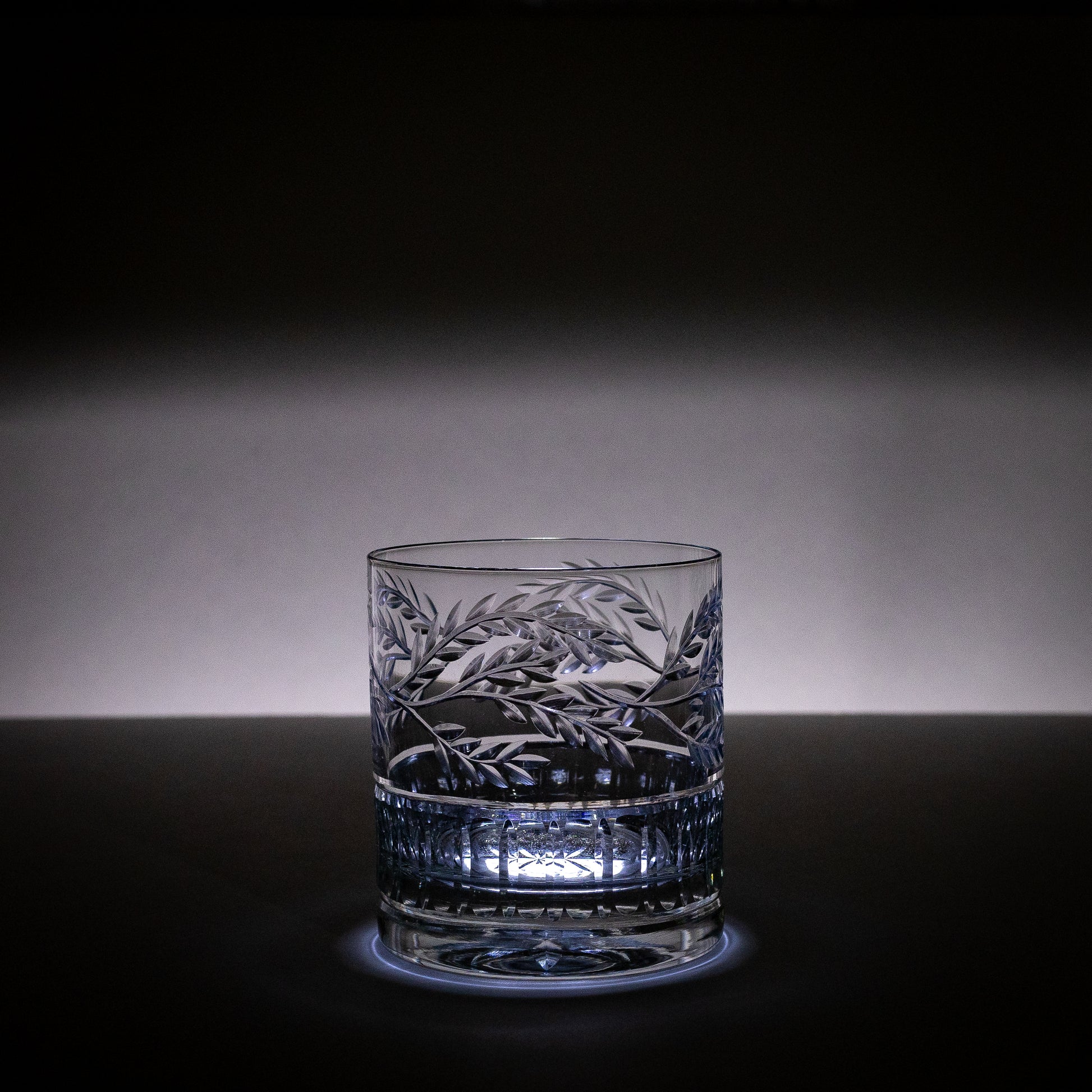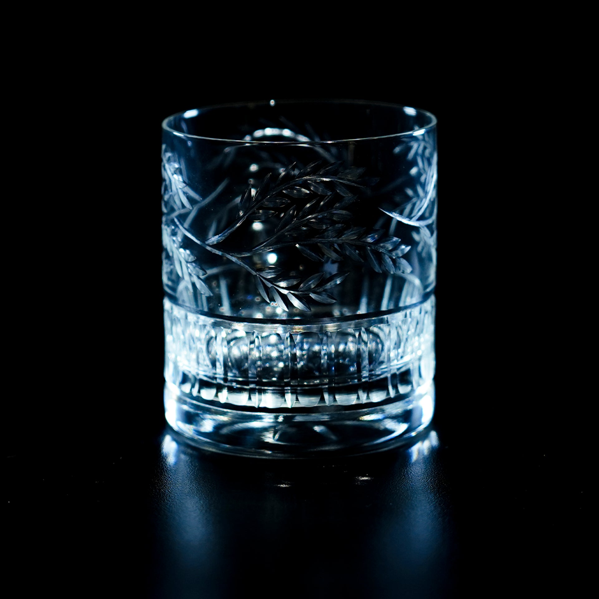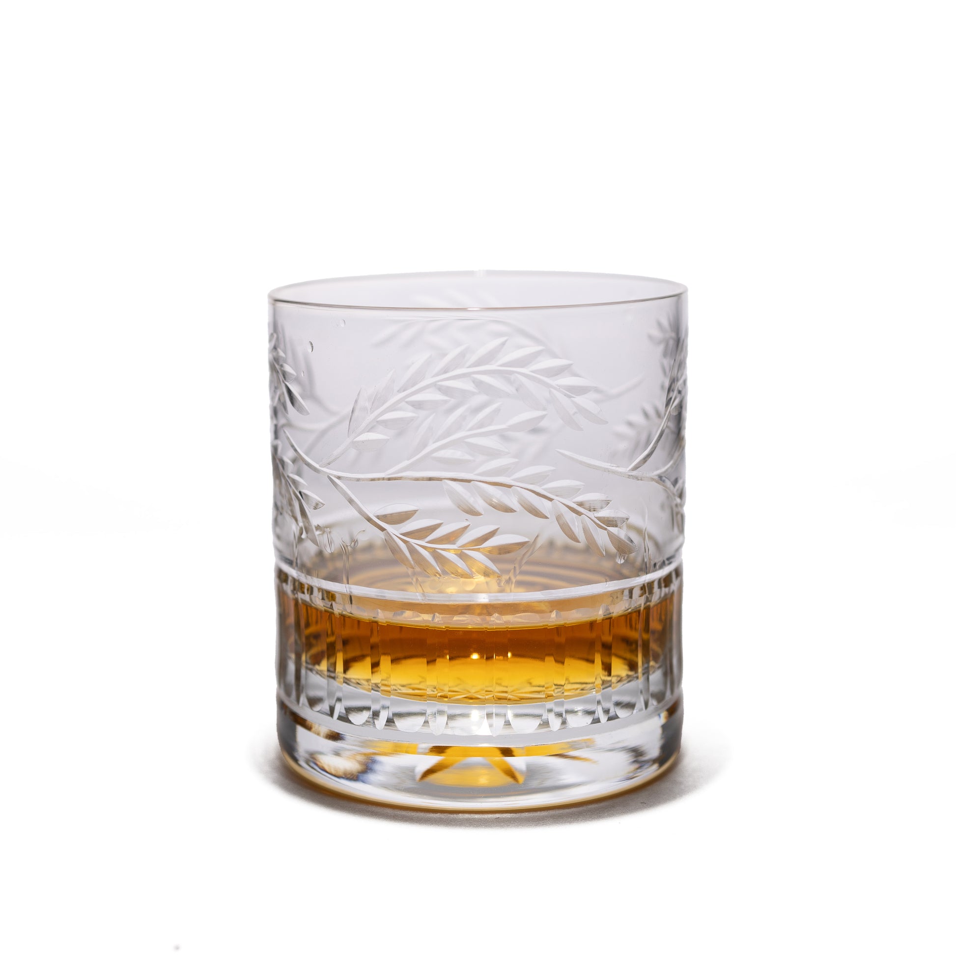 A cord of round and straight cuts gives the bottom of the glass a dazzling handhold while the top display an organic weaving vine design. These rocks glasses combine traditional and contemporary styles that draw the eye into the fine details of the pattern.