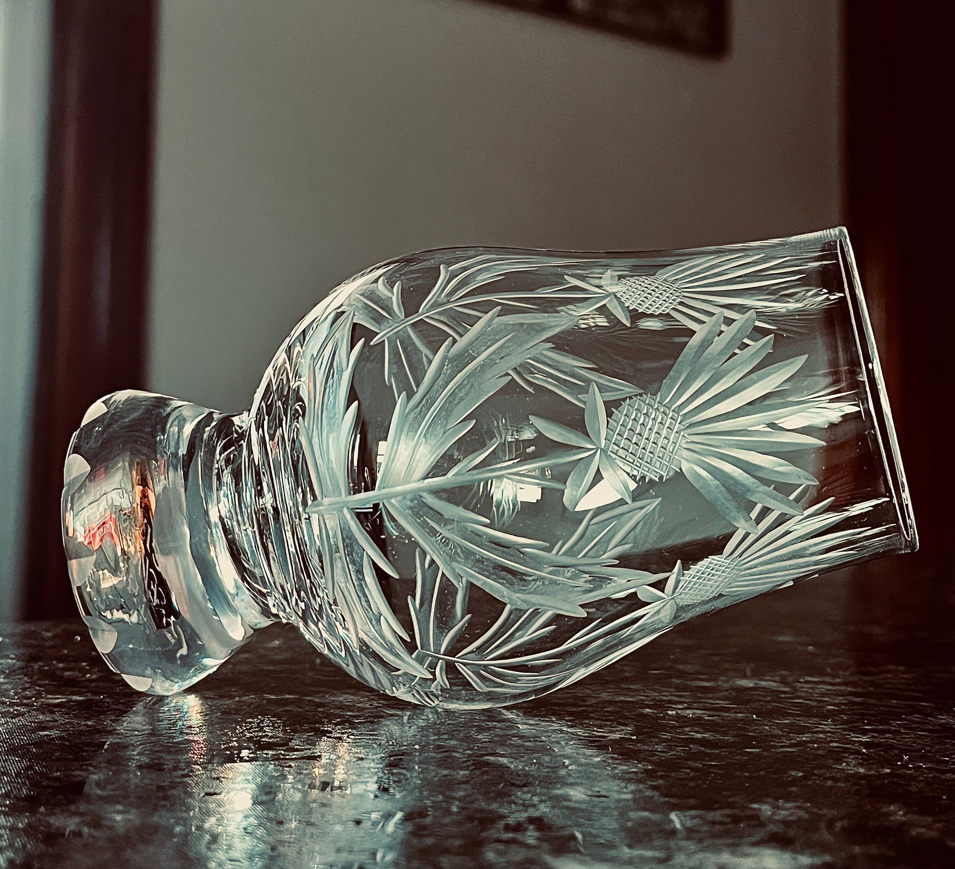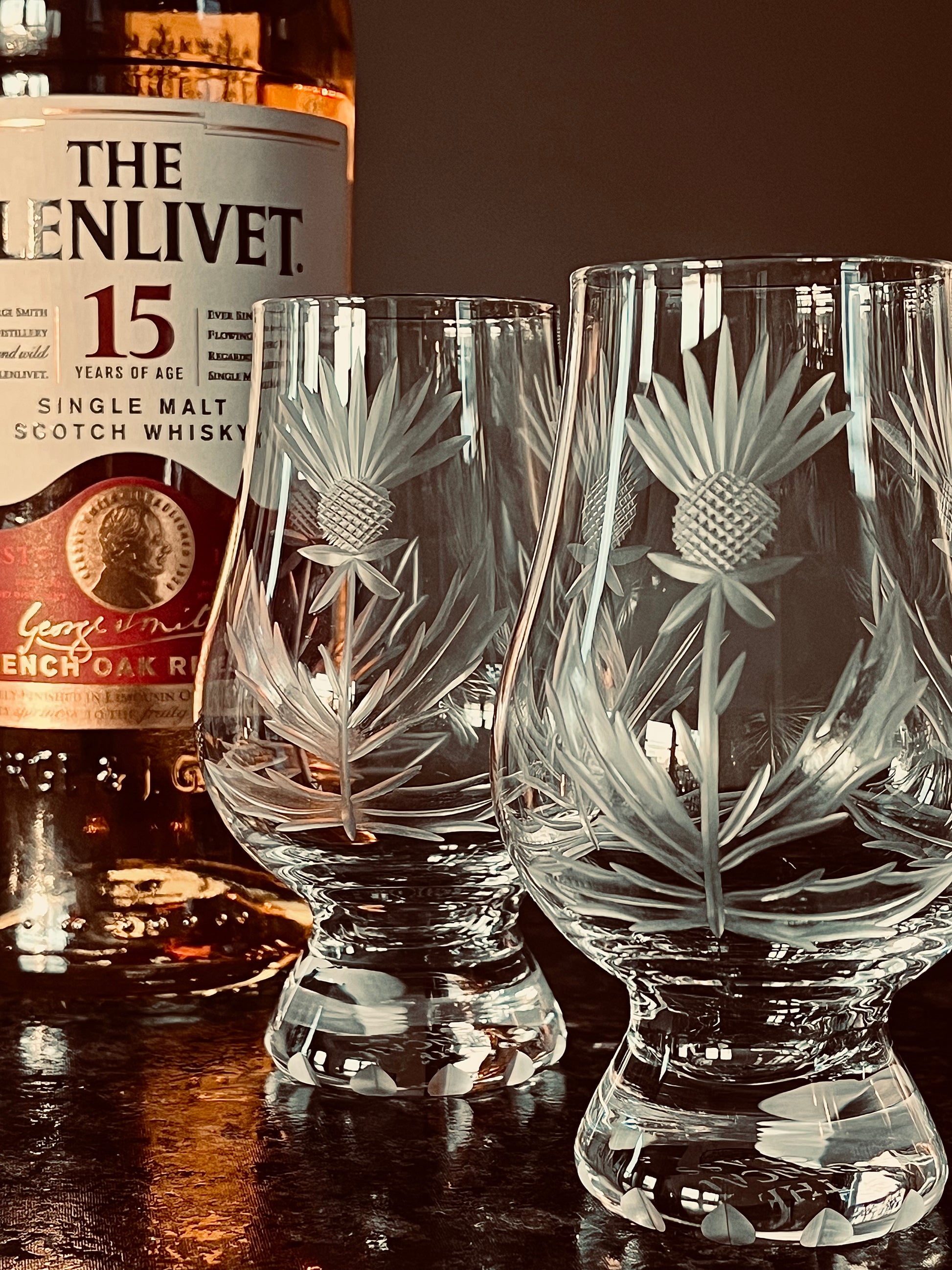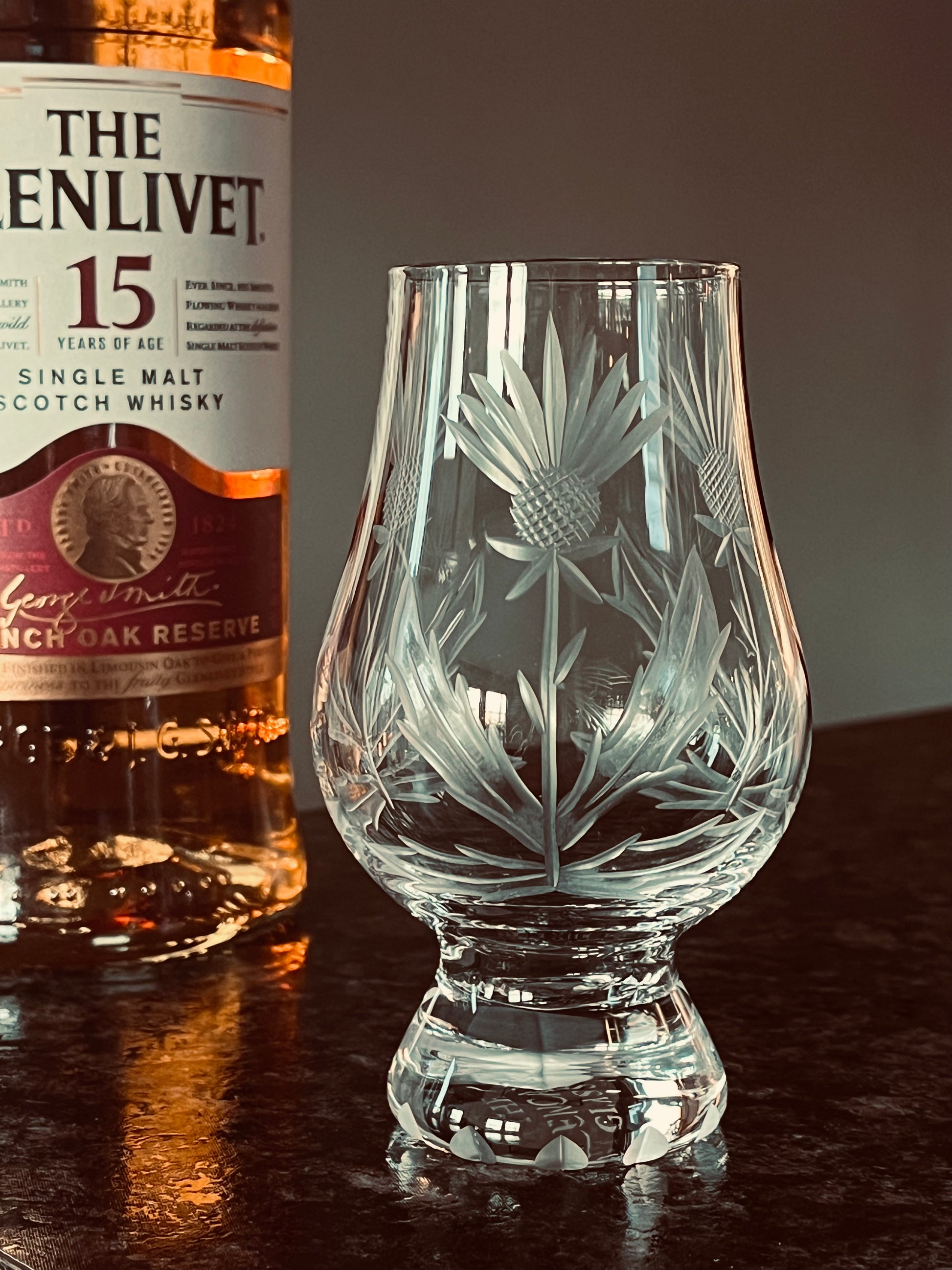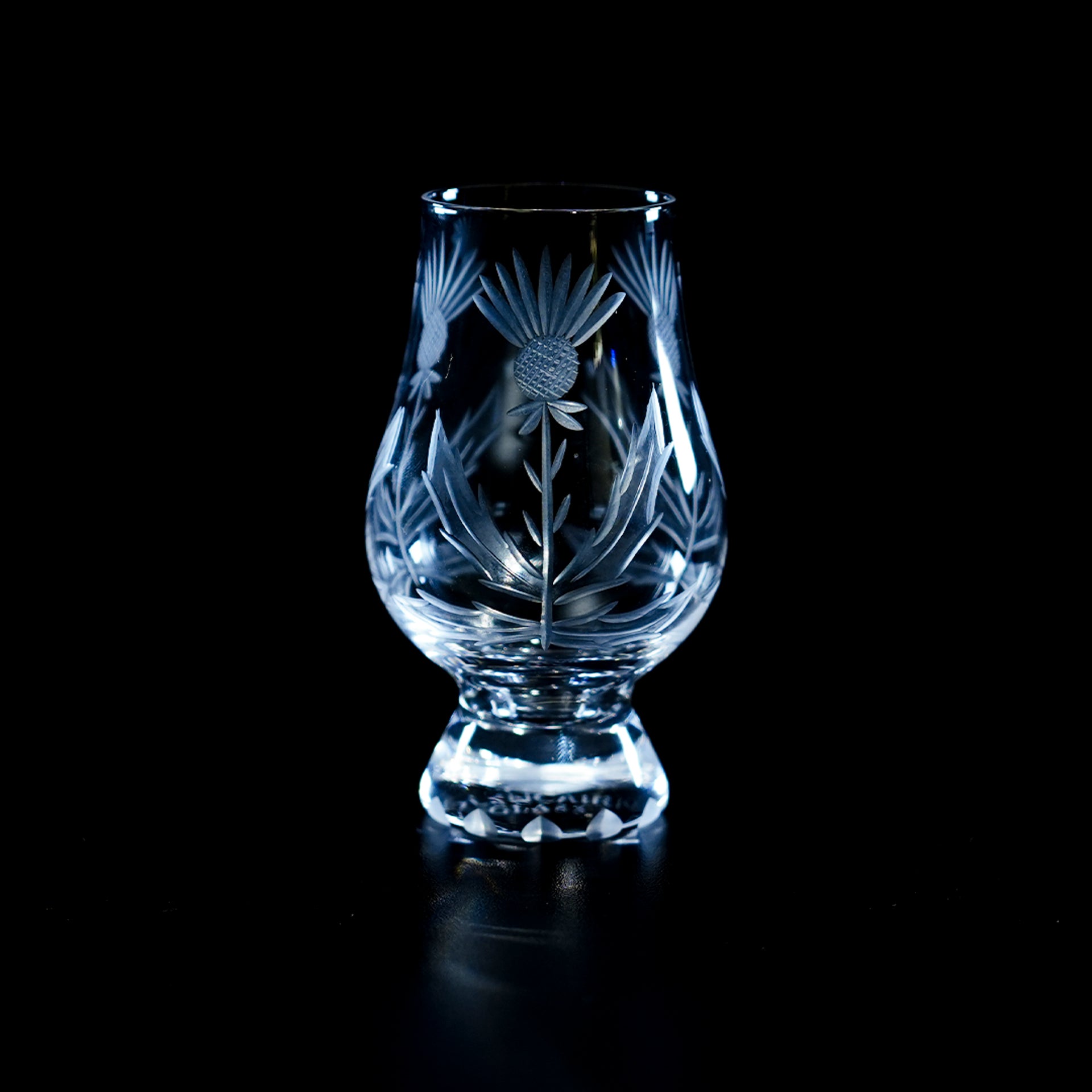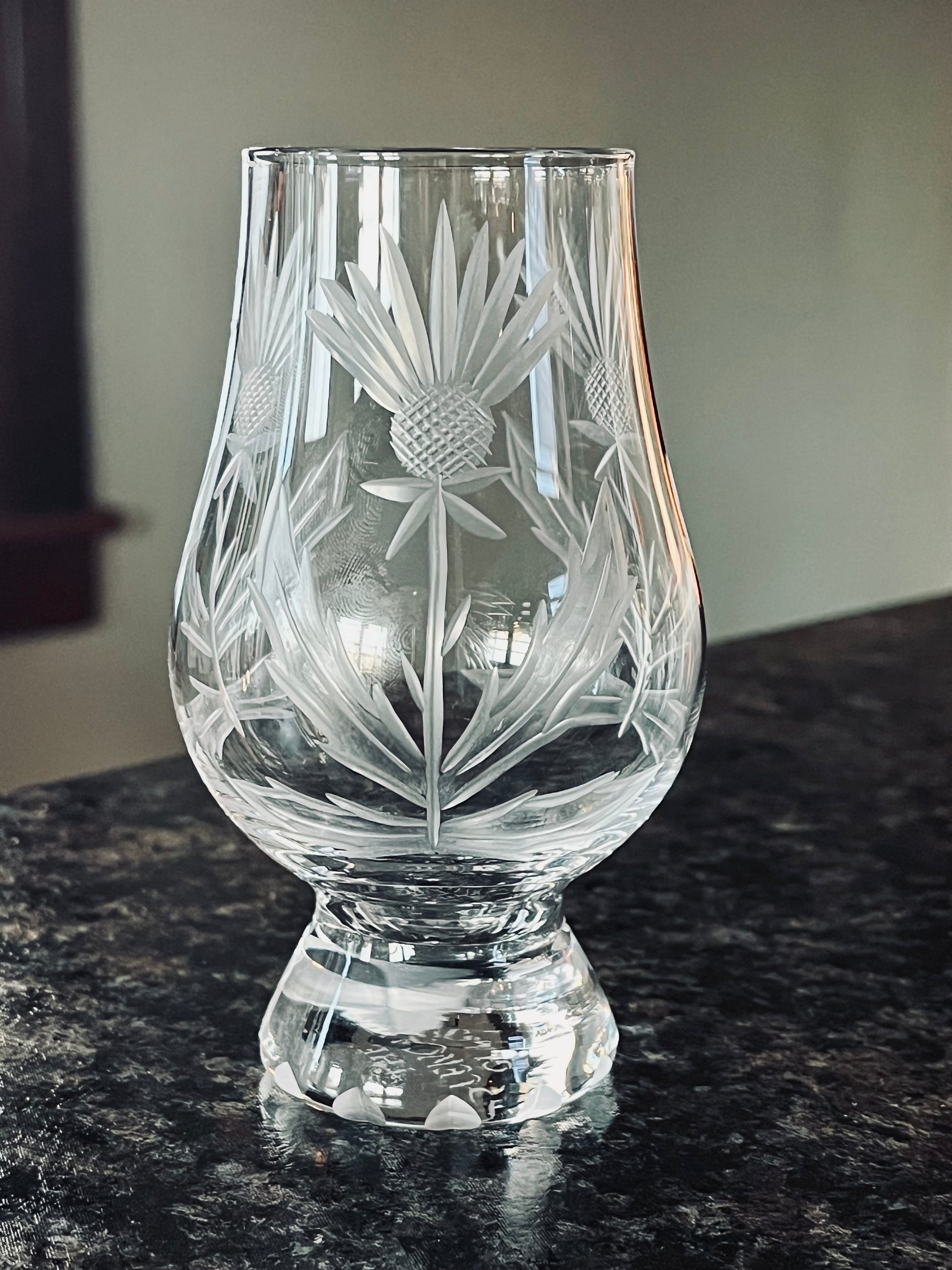 Three large thistles surround the glass with a miter cut foot. Add them to your barware collection or give them as an elegant gift!