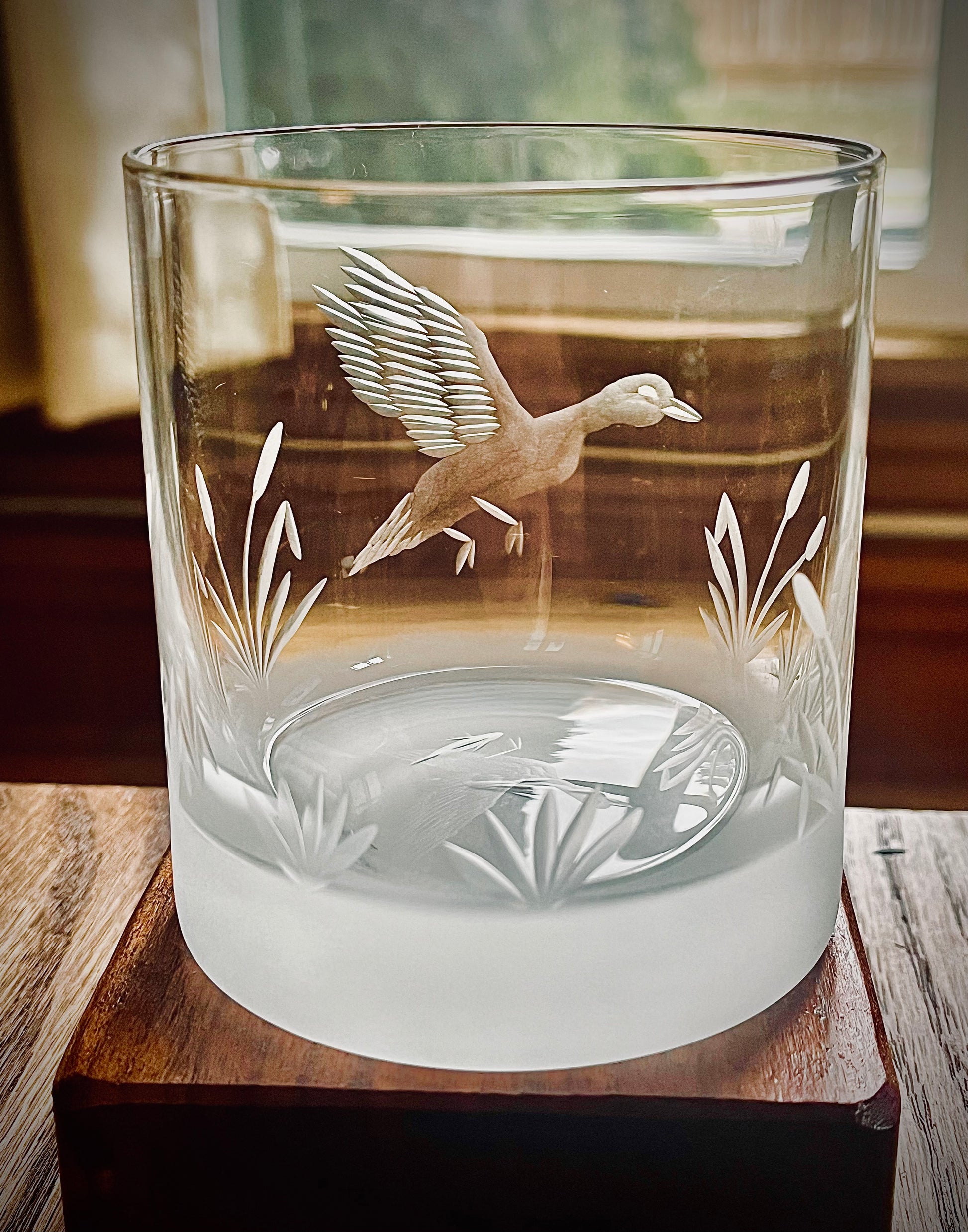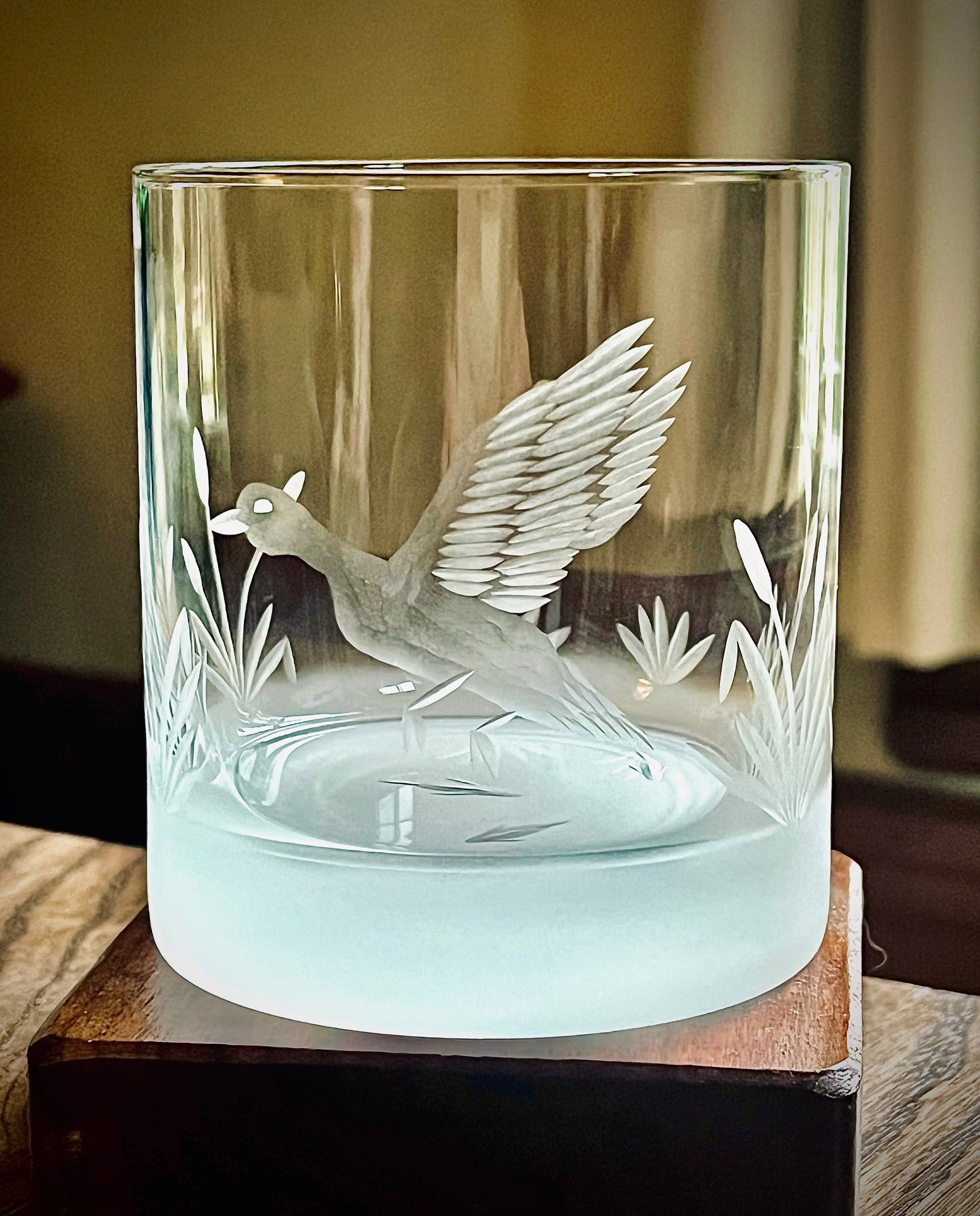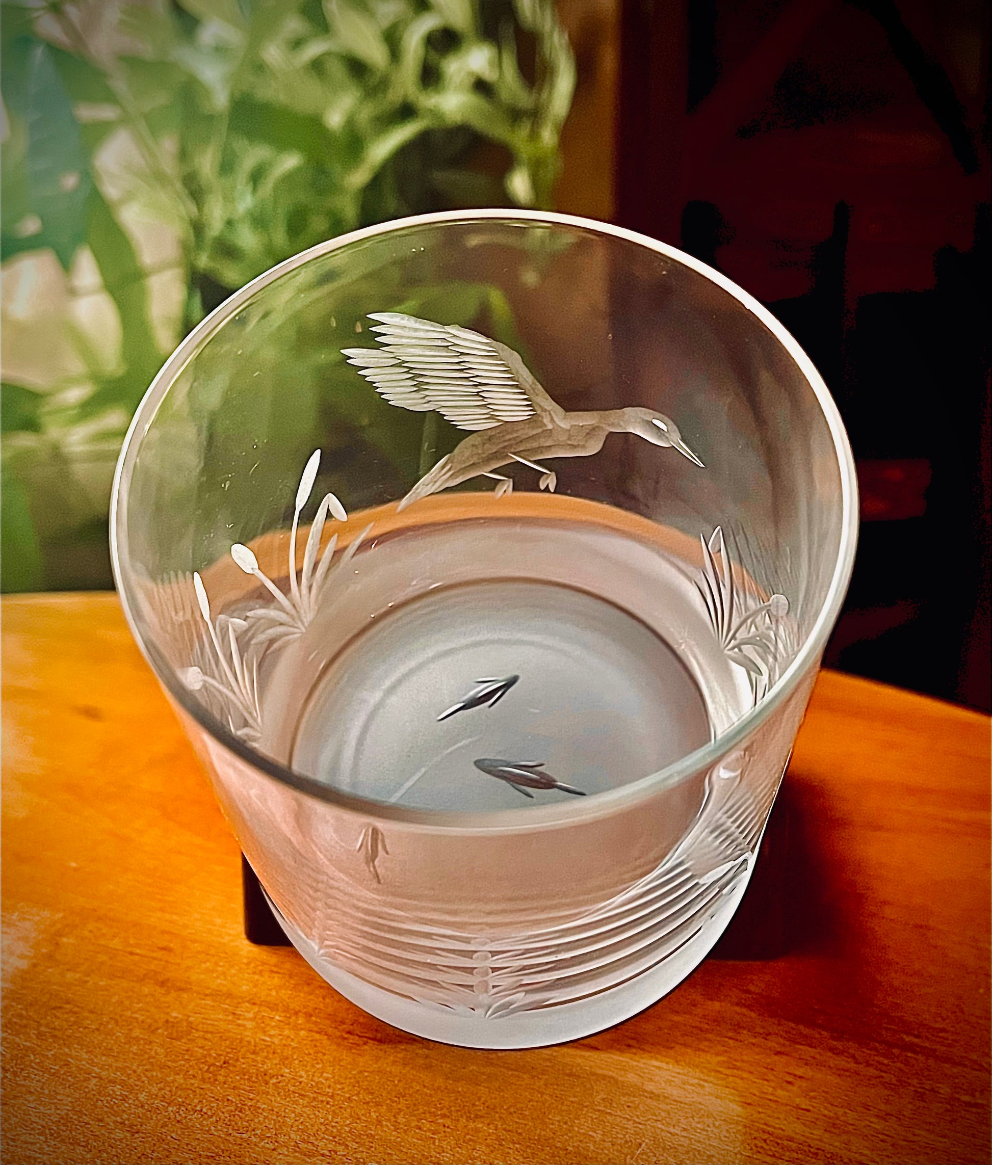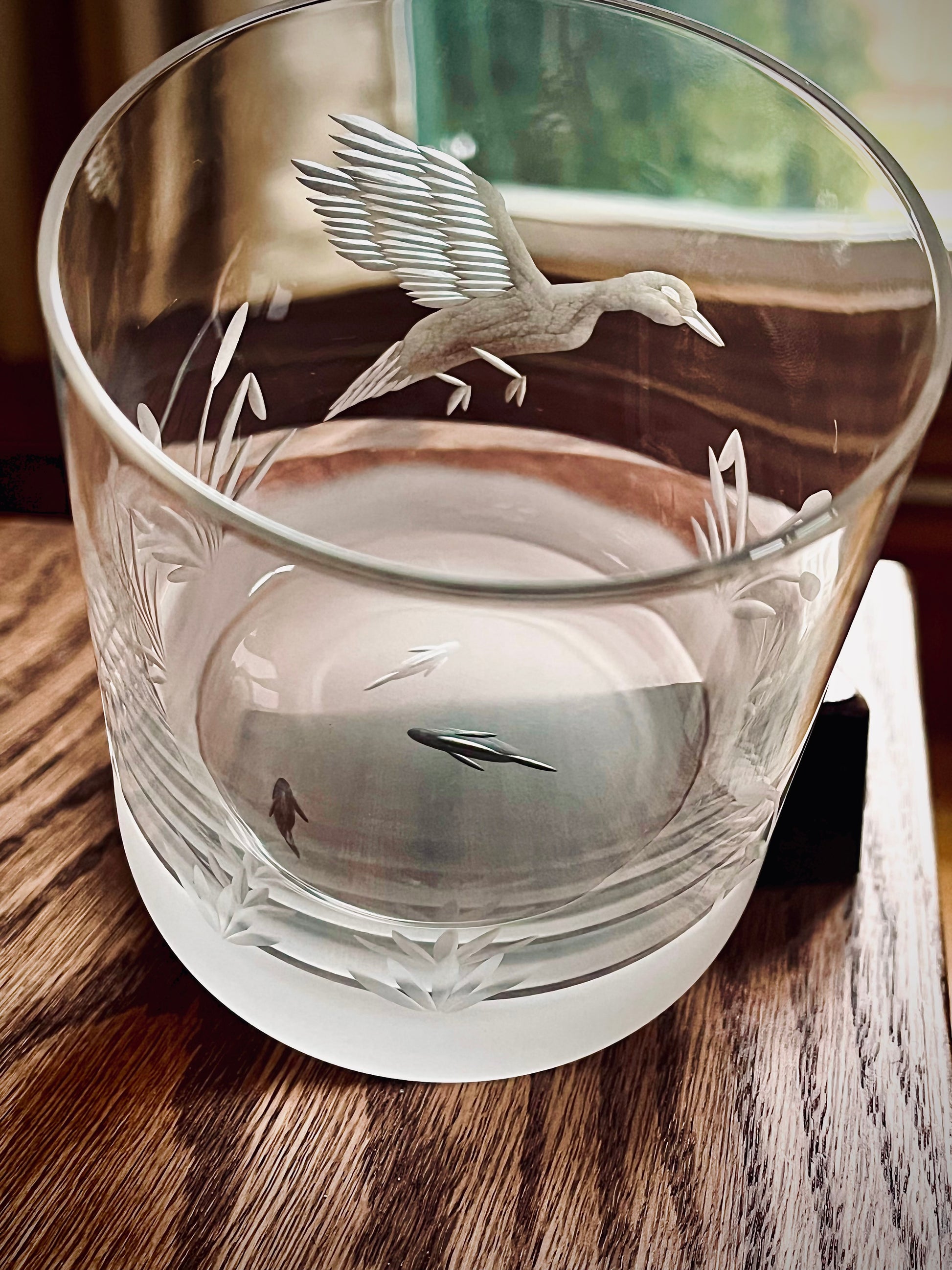 Featuring a wetlands scene with a duck and fish, this amazing whiskey glass captures the beauty of the outdoors!