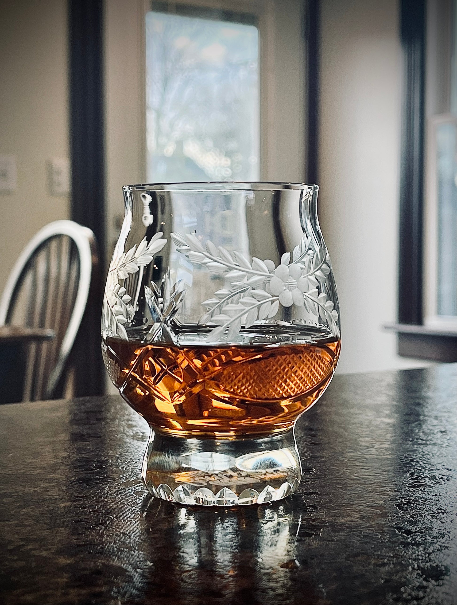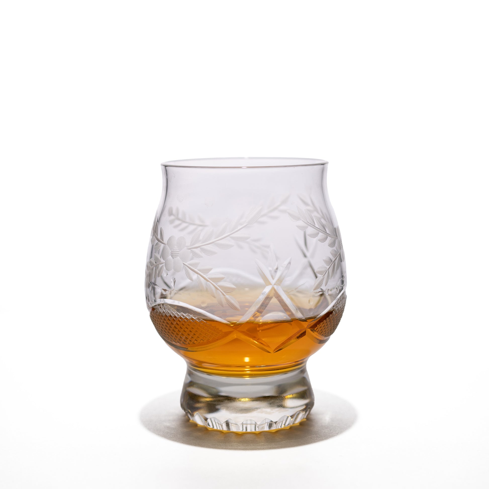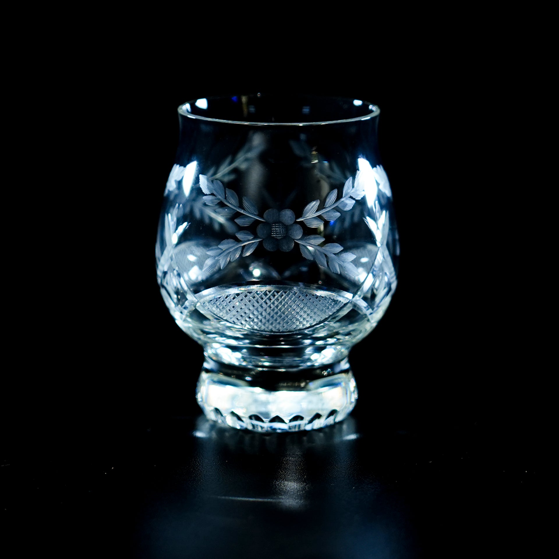 Featuring wheel engraved flowers, a stunning pattern of polished cuts and fine diamonds and a scalloped foot, these Libbey Kentucky Bourbon Trail Glasses are a rare take on the beautiful artform or wheel engraving. These are the only cut versions of this glass in the world.